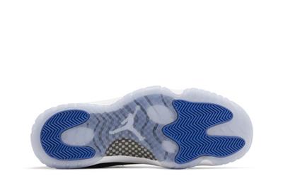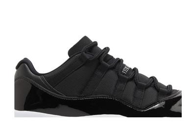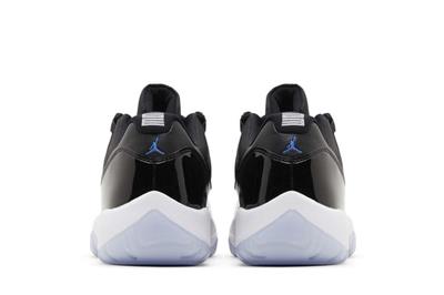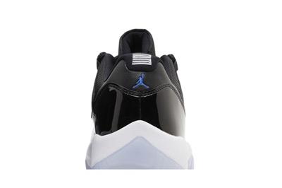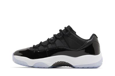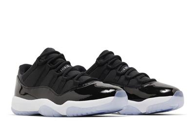 The Air Jordan 11 Retro Low Space Jam is based on the high-top AJ11 of the same name, featuring a black ballistic mesh upper with a tonal patent leather mudguard. Rope laces feed through webbing eyelets for a secure fit, while the back heel is marked with a stylized 23 and Jumpman logo. Supporting the sneaker is a white Phylon midsole, fitted with full-length Air-sole cushioning and an exposed carbon fiber plate. A translucent rubber outsole utilizes herringbone traction pods for superior grip.