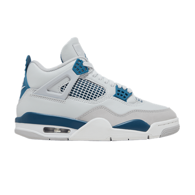 The 2024 edition of the Air Jordan 4 Retro Military Blue also known as 'Industrial Blue' brings back a coveted OG colorway of the legacy silhouette. Smooth off-white leather is utilized on the upper, featuring quarter panel netting and a tonal nubuck forefoot overlay. A vibrant blue Jumpman logo adorns the woven tongue tag, matching the molded eyelets and a back tab marked with Nike Air branding. The sneaker rides on a lightweight polyurethane midsole with encapsulated Air-sole cushioning in the forefoot and a visible Air bag in the heel.